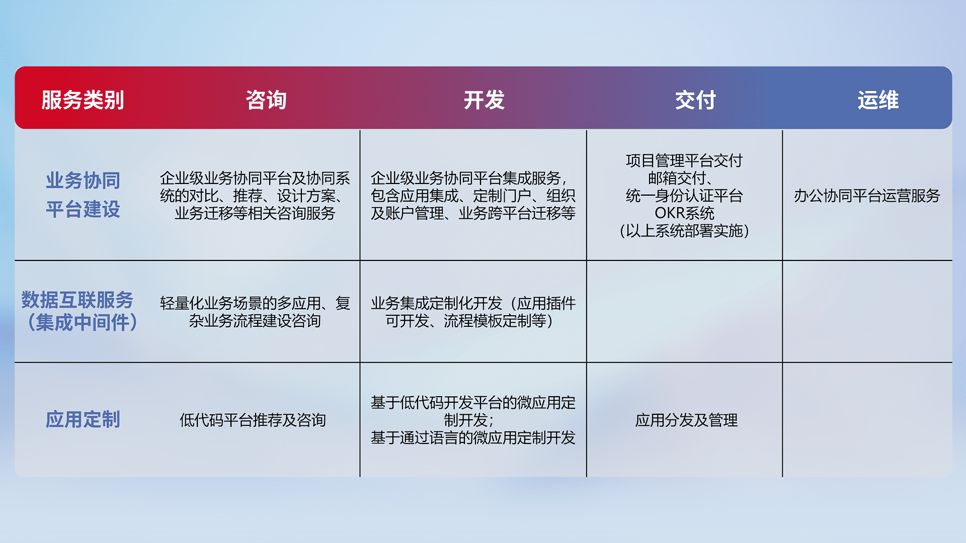 针对钉钉、、、企微、、、、IDaas等平台级产品提供产品的规划、、方案、、、交付、、定制化开发等服务,,,实现如统一协同办公、、、、智能客户服务、、混合会议管理、、智能数据查询、、、、等业务场景,,,实现数字化转型。。